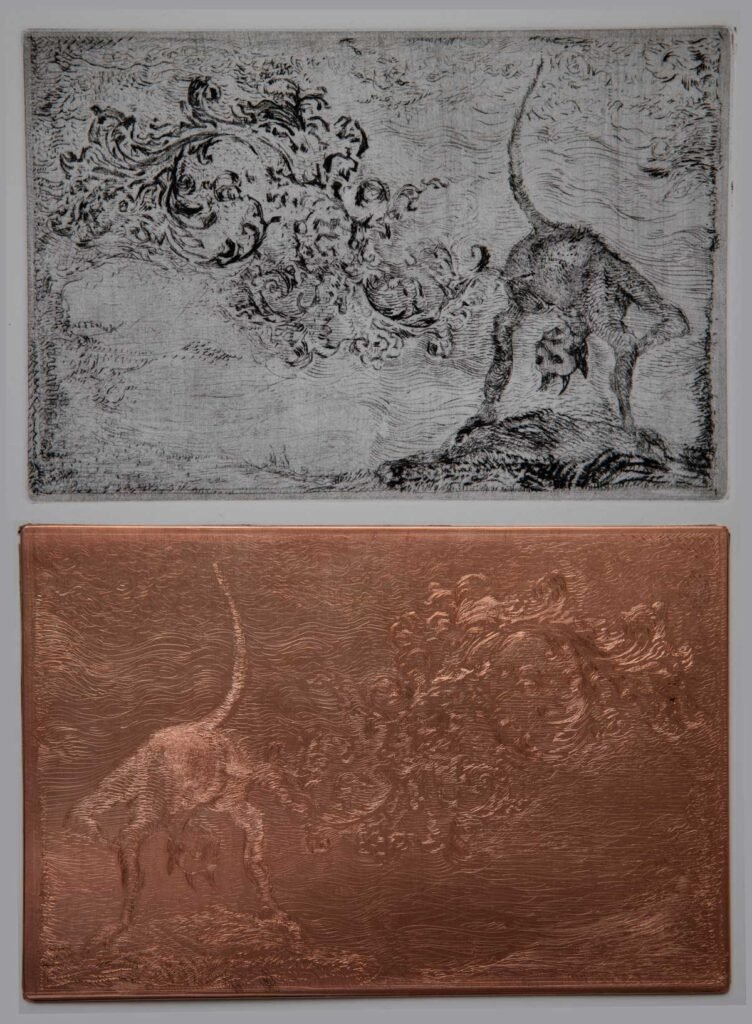 The technique is dryneedle, which sounds like a medieval medical procedure and behaves like one too. A needle scratches directly into the plate. Dryneedle records hesitation, swagger, tremor, and pressure. It turns a hand movement into a fossil.